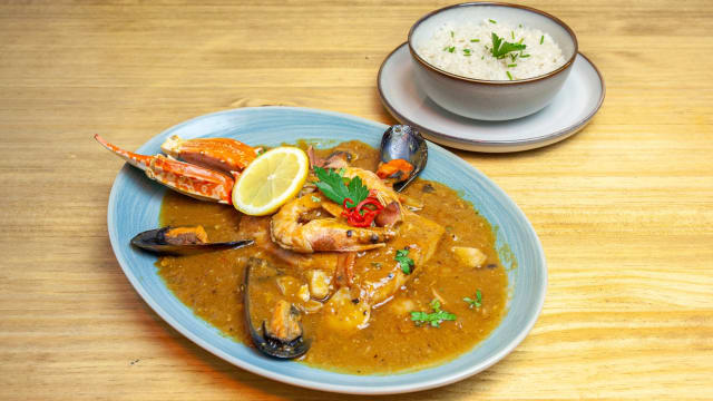 Pescado en salsa de mariscos y especias peruanas acompañado de patata y arroz. Fish in seafood sauce and peruvian spices accompanied with potatoe and rice.