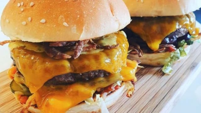 Pain bun Lalos (MOF Boulanger), steack d'Aubrac, sauce Tambouille, concassé de tomates, pickles, oignons frits, fromage cheddar et bacon grillé (option sans bacon et/ou fromage)