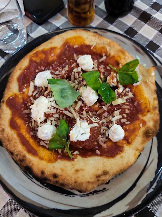 - Pomodoro superiore nolano, fior di latte di agerola, funghi freschi ,prosciutto cotto alta qualità, salame napoli, olive di leccino, carciofi rustici all'uscita e basilico fresco locale