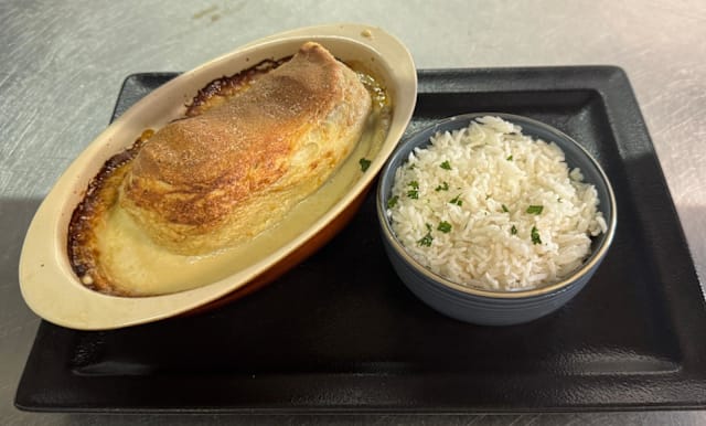 Spécialité lyonnaise à base de brochet, nappée d'une sauce aux crevettes onctueuse et gratinée au four accompagne de riz