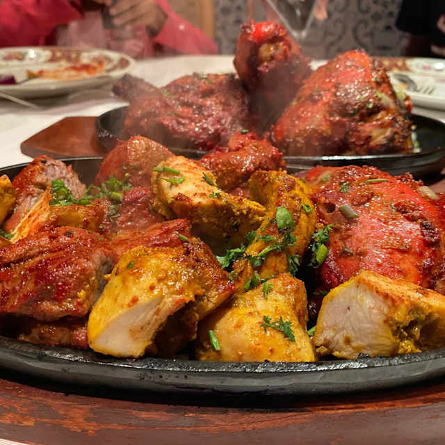 - Assortiment de différentes grillades telles que boti kebab, tikka kebab, shish kebab, poulet tandoori, king prawn, servi avec salade ou légume et pain nan