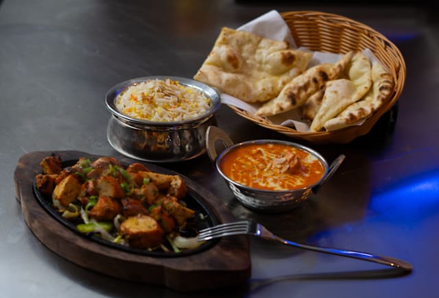 Gegrilde paneerblokjes in een rijke saus met gember, knoflook, tomaat en paprika. Geserveerd met vers naanbrood.