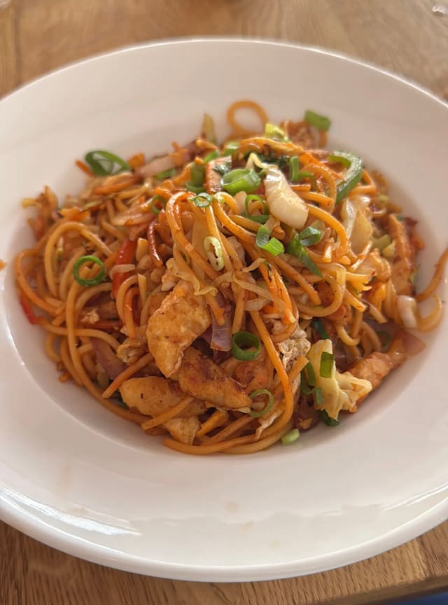 Krokante kipstukjes in een pittige chili-knoflook saus met ui en paprika.