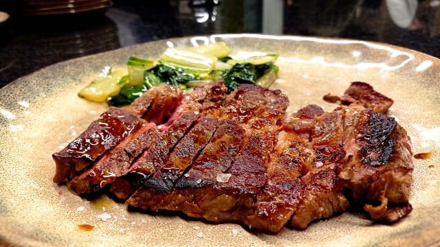 Tagliata di manzo, riduzione di porto, patate con fonduta di formaggio, verdure, sale maldon, olio evo.