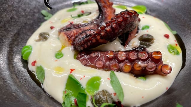 Polpo in doppia cottura, spuma di patate, crostino di pane, piselli, porro, pepe rosa, erbe aromatiche, olio.
