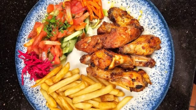 Met ui, peterselie, olijfolie, speciale kruiden en keuze uit friet of rijst.