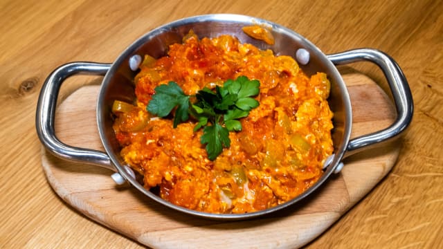 Met ui, peterselie, olijfolie en speciale kruiden, boter en yoghurt mintsaus.