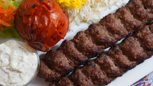 Spiedo misto di pollo allo zafferano persiano e manzo, riso basmati o insalata