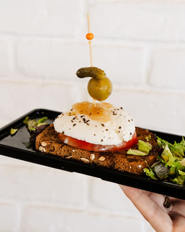 - Pan brioche de patata, carne doble smash de 100gr cada una, queso chedar, queso gouda, bacon, rulo de queso de cabra, confitura de tomate y cebolla crujiente