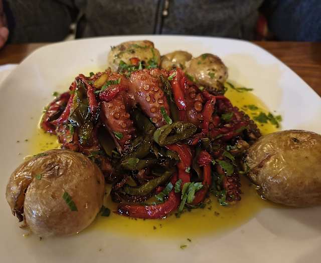 Grilled octopus served with baked potato