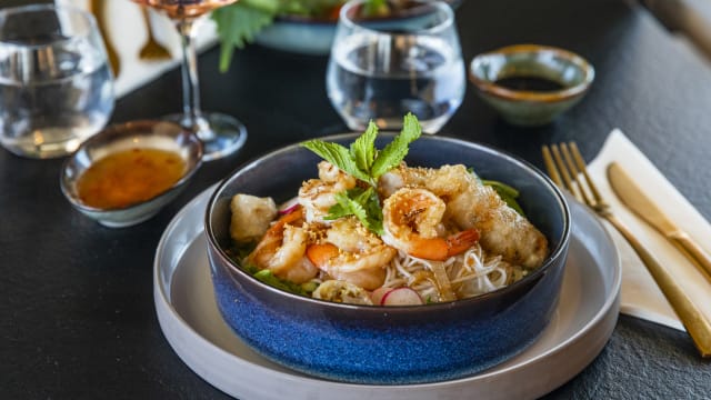 Boeuf wagyu mariné, vermicelles de riz, soja,
