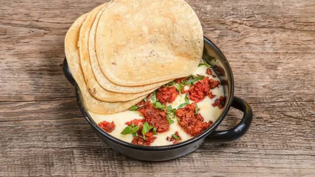 - Delicioso queso fundido, tostado relleno de nuestra ternera salteada, acompañada de pico de gallo