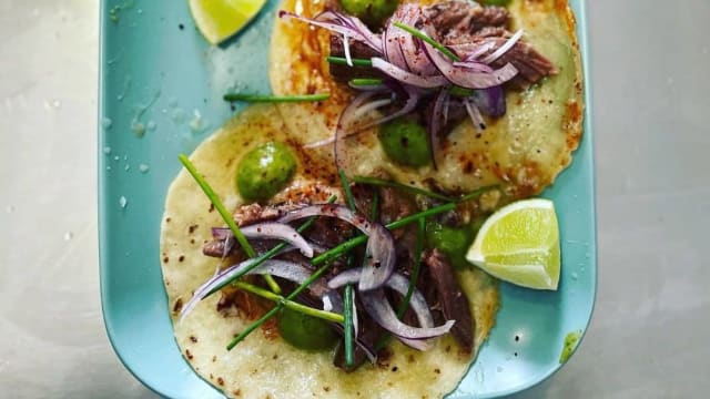 Cachaço de porco, pico de gallo, molho verde