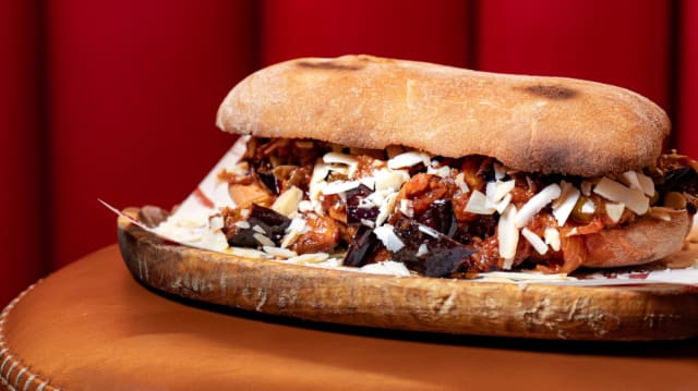 Hamburger di scottona siciliano, tuma al pepe nero, guanciale di suino nero dei nebrodi, maionese home made, pomodori a fette e insalata verde