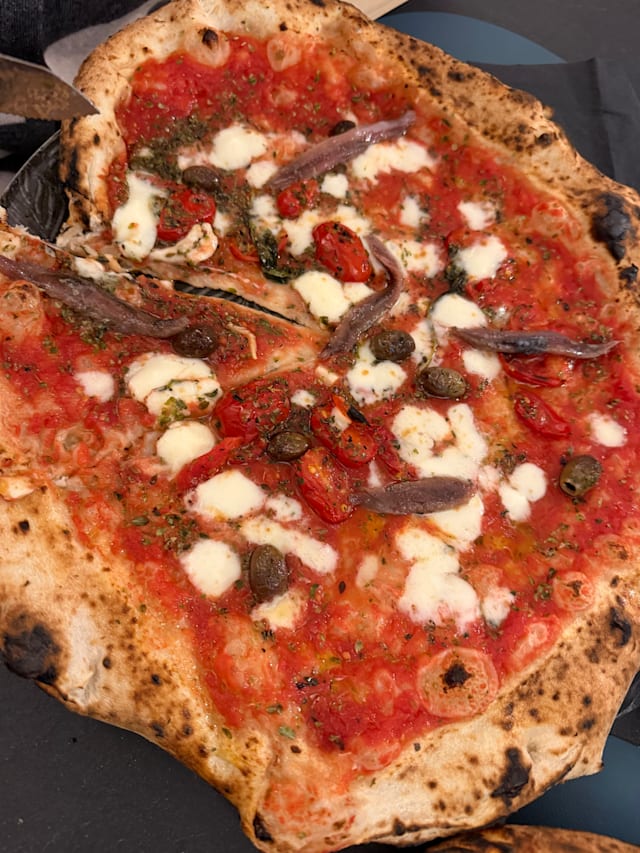 Stracciatella di bufala, pomodorini gialli, acciuga, battuto di limone, olio evo, basilico.