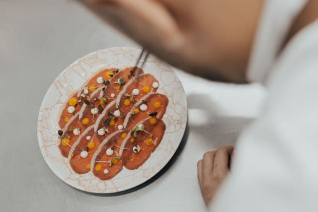 Unique Vitello Tonnato, made with thinly sliced Roast Beef, a delicate Tuna and Caper Foam, homemade Pickle Tapenade, and Crispy Capers