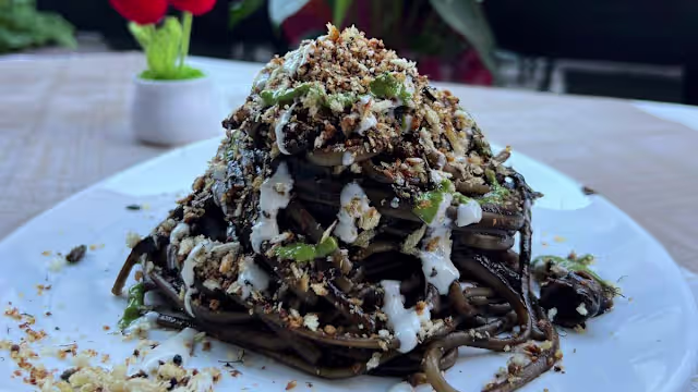 - Linguine fresche, aglio, olio, peperoncino e prezzemolo con muddica atturrata e nduja.