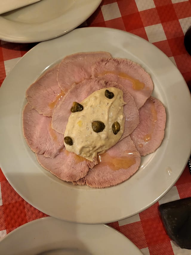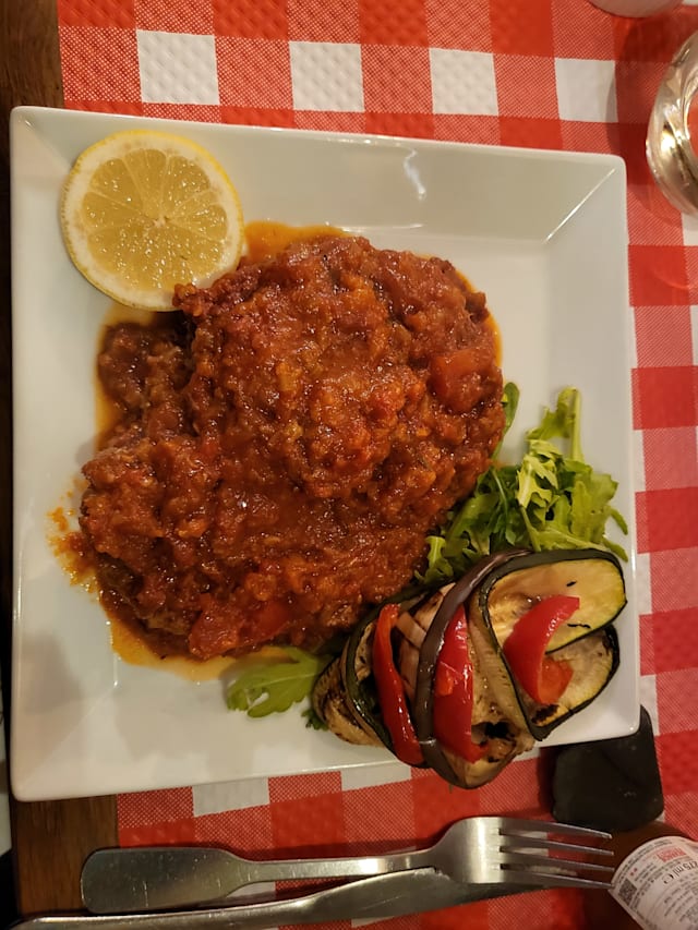 7/10We had amazing gluten free pumpkin ravioli and gluten free vegetable pizza with large slices of zucchini and eggplant. Glass of sparkling wine. We did not order dessert but the people next to us had pistachio taramisu. It was amazing food. The waitress was in a very bad mood and threw dirty plates down and was short with customers. She was visibly raging angry. So hopefully that’s not her personality and was just having a bad day. But overall great place.