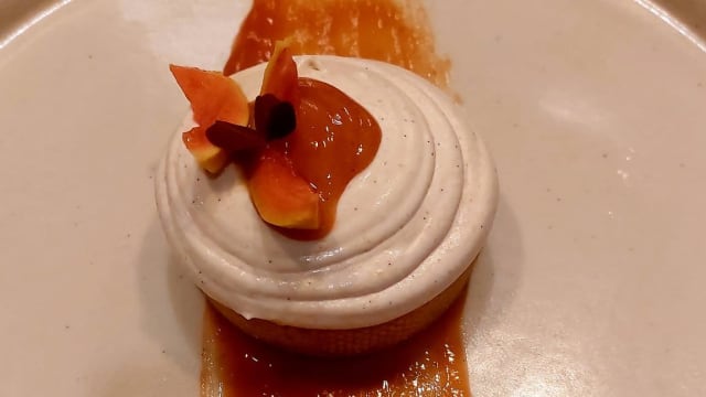 Rabanada caramelizada, gelado de baunilha, crumble de manteiga, creme inglês de Baileys e erva cidreira