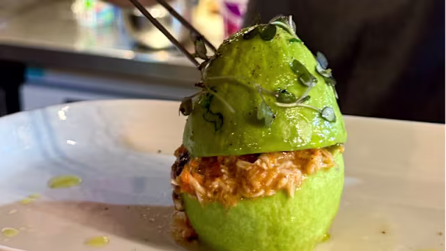 - Sapateira fresca, lima, coentros, azeite virgem extra e microgreens