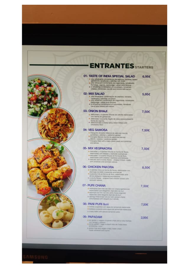 8.5/10We visited restaurant for early dinner. Order for starters pani puri and salad of the house, pani puri was ok but nothing special and salad was good. For the main dish I had Tandoori gambas and my partner Lamb curry, both dishes were delicious but not spicy enough as we asked. All together we recommend said restaurant