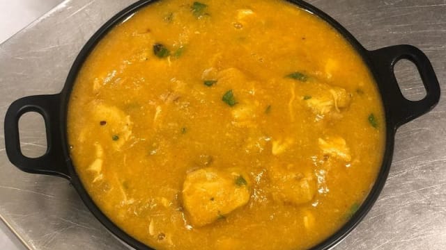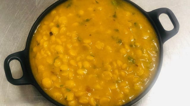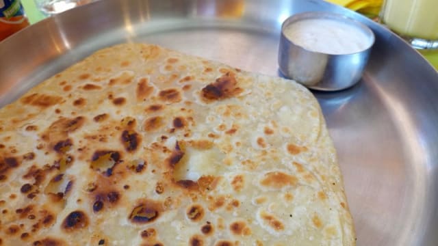 Pane fritto con crema di ceci, peperoncino verde, cumino coriandolo, uova, patate, salsa di tamarindo