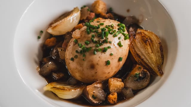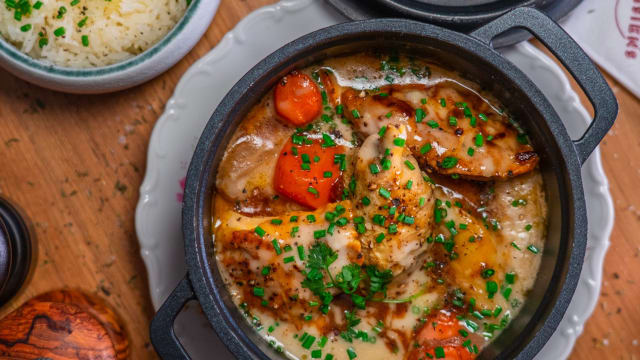 Coffre de volaille cuit à basse température servi avec une sauce suprême onctueuse, pommes de terre rissolées fondantes au beurre noisette.