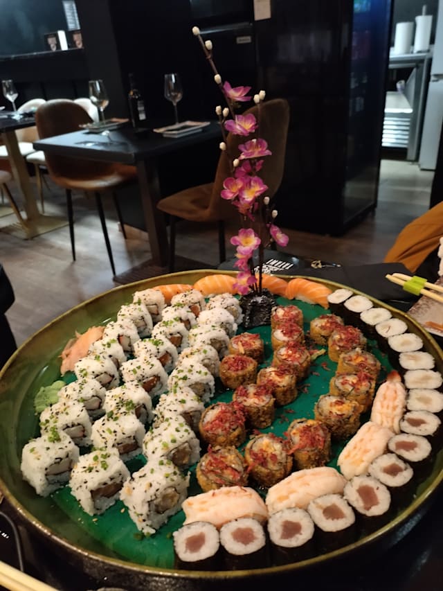 24 uramakis (salmão, delícias do mar e camarão), 16 hossomakis (atum e peixe branco), 16 hot rolls (salmão e delícias do mar) e 8 nigiris (camarão e salmão)