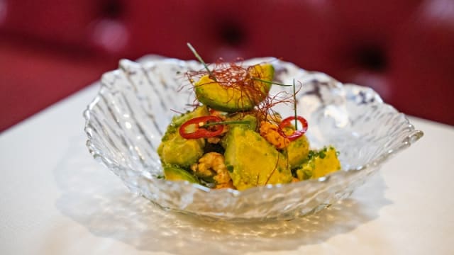 Ensalada de aguacate, canónigos, piñones y toques frescos
