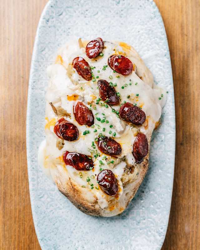 - Coca de berenjena , miel de su, queso tierno tilers y xistorra con ratafia