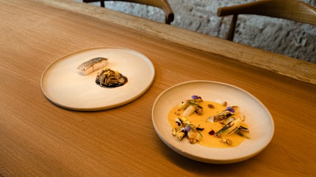 Mesa gastronómica de paisaje para compartir. Menú degustación de temporada con opción vegetariana en un edificio histórico junto al mercado de Santa Caterina. Cocina mediterránea de pequeños productores entre la tradición y la invención. Premio Cargol Slow Food (2024).