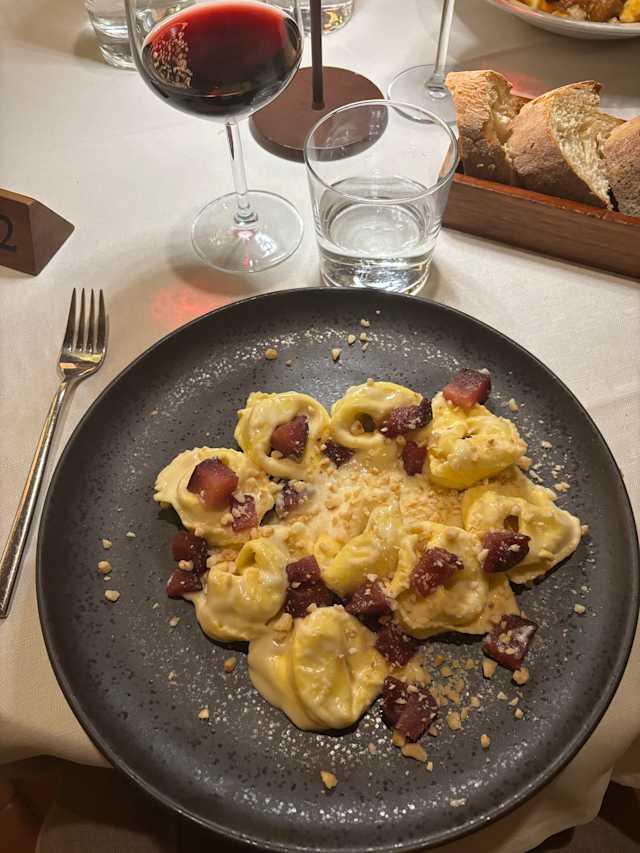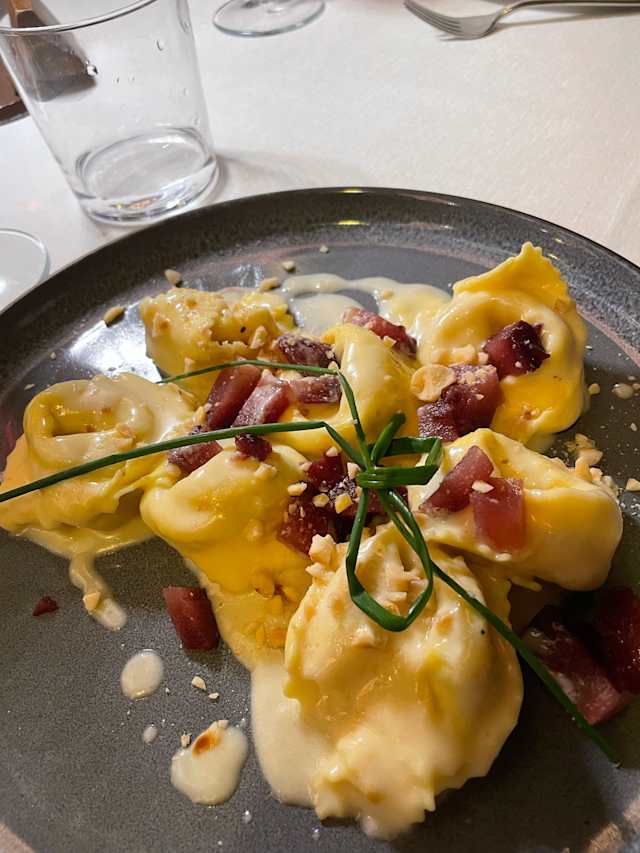 - Tortelloni al tartufo con fonduta di castelmagno, concasse' di pera cotta al valpolicella e crumble di nocciole