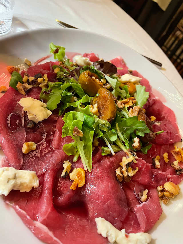 - Carne salada con mousse di zola dolce, fichi, noci, pomodorini confit e riduzione di chianti classico