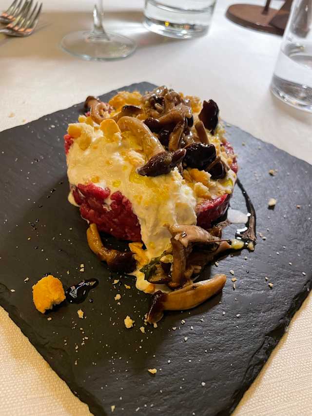 - Tartare di bisonte funghi, stracciatella e crumble di tarallo profumo di tartufo
