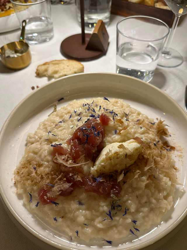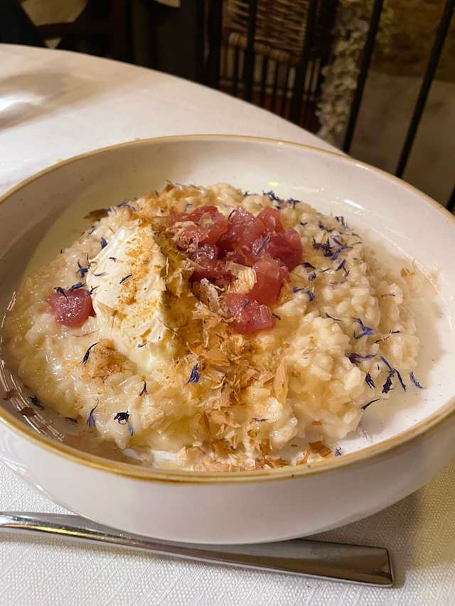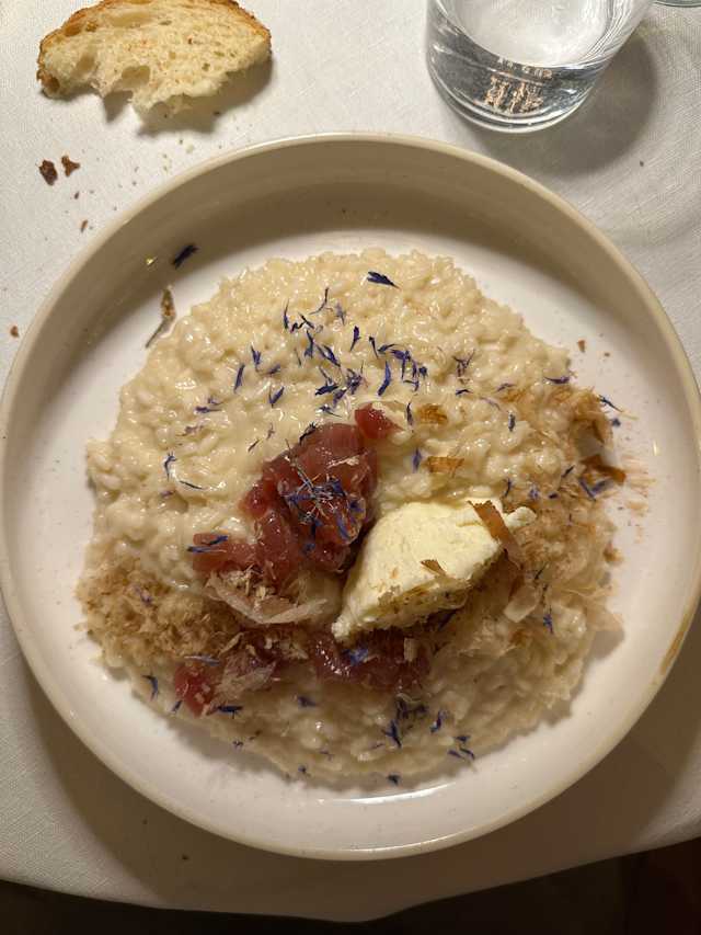 - Risotto carnaroli mantecato al burro di violetta e fiordaliso blu, accompagnato da tartare di tonno con cremoso al parmigiano e katsobushi