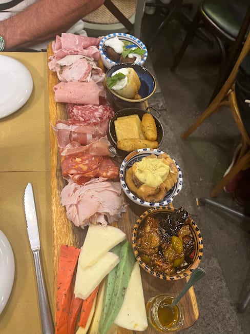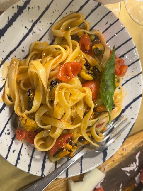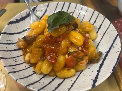 10/10On a very lively street. The mixed platter to starter was amazing, a very good selection of meats, cheeses etc The house red was nice and we both had pasta dishes with seafood. All very tasty and reasonable