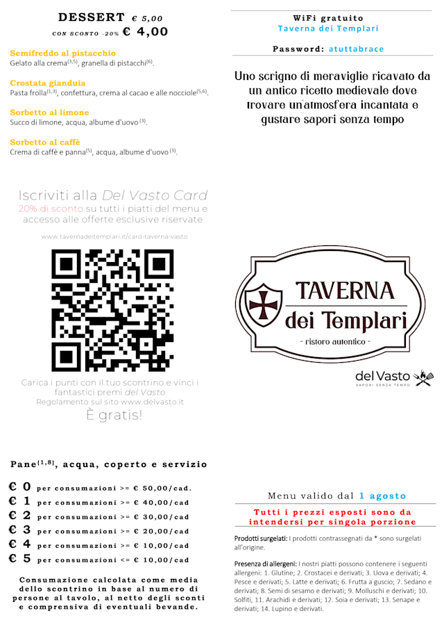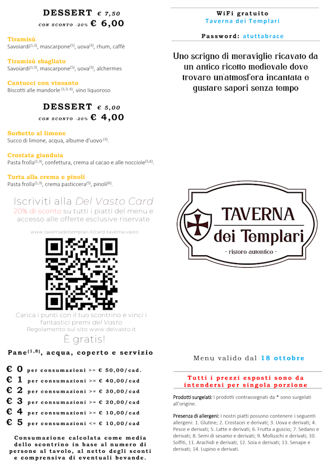 Yes, Taverna dei Templari is offering 20% off the 'a la carte' menu Reserve your table and enjoy your special discount now on TheFork!