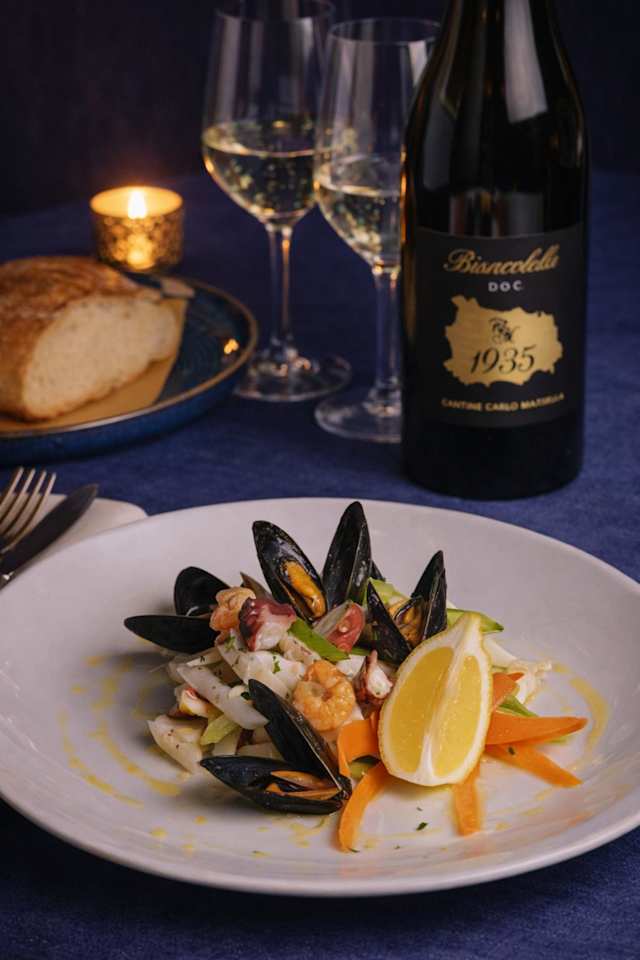 - Calamari, gamberi, polipo cozze sedano e carote, salsa citronette