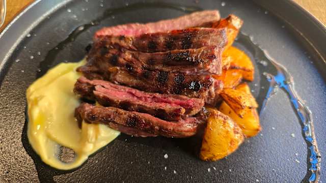 - Diaframma di black angus USA (250 g), salsa ajoli allo zafferano e patate novelle alla paprika