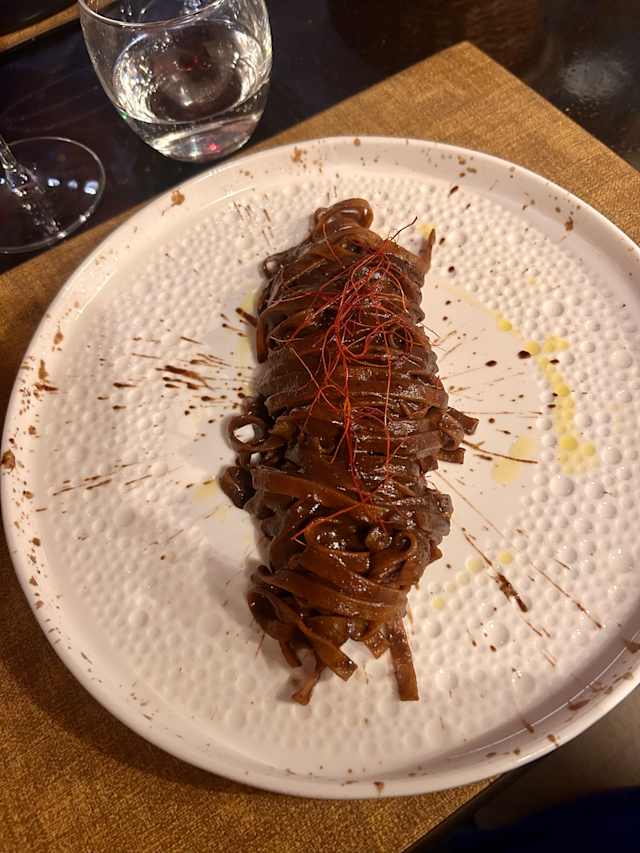 - Tagliolino all’uovo, aglio nero fermentato burro alle acciughe, habanero e zest di bergamotto candito