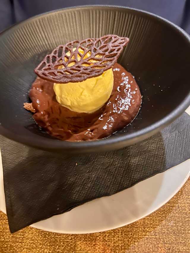 - Mousse di cioccolato fondente soffiato, crubmle di castagne e nocciola e gelato alla crema