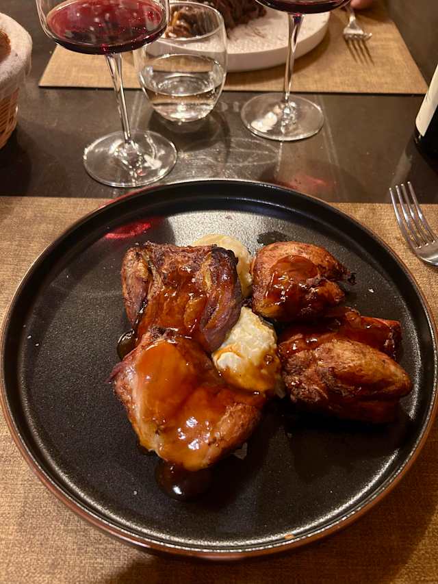 - Guancialino di maiale, riduzione di barbera, miele, soffice di patate americane