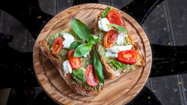 Secondo disponibilità. Vegetariano, vegano. Avocado fresco servito su pane tostato con limone, sale e olio