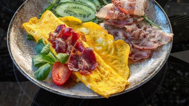 Waffle con frutta; guanciale e uova strapazzate/tortilla con prosciutto cotto; bevanda di caffetteria a scelta; succo di frutta a scelta