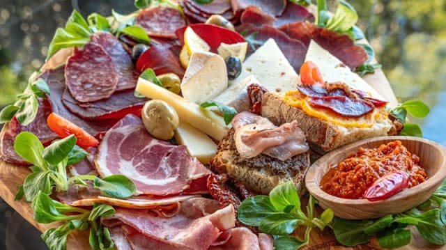 Prosciutto cotto di agnello, mortadella di cinghiale al tartufo, salame di capriolo, prosciutto di cinghiale, prosciutto di cervo, bresaola di cavallo, prosciutto di daino, cacio e pepe rosa, formaggio di capra, pecorino marchese, bruschette speciali