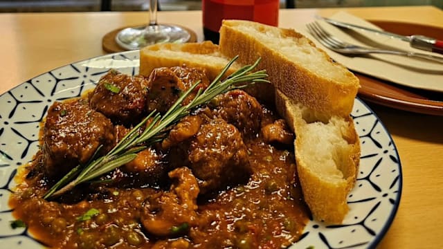 Cocina de siempre, con salsa melosa y setas.
