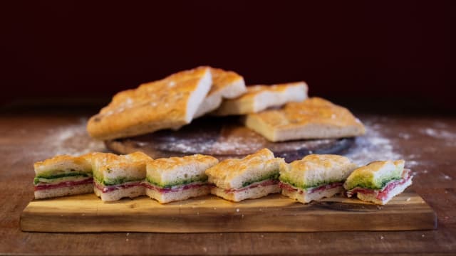Focaccia ripiena di carne battuto al coltello, spezie, erbe aromatiche e cipolle