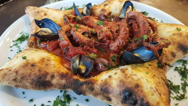 (Polipetto alla luciana, cozze, fiordilatte, pecorino e olio piccante)