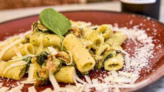 (Crema di pistacchio, salsiccia, datterino giallo semisecco, stracciata di bufala campana, olio al rosmarino)