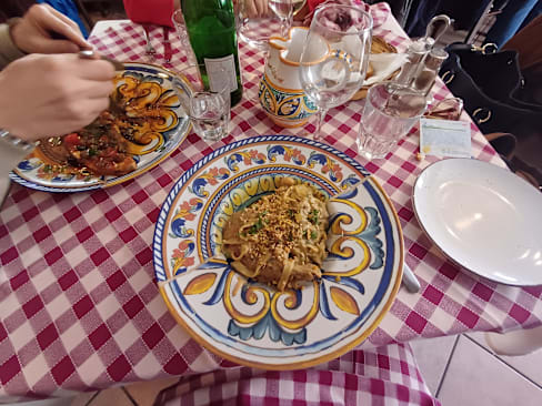 10/10A charming taverna set in relaxed Sicilian style. The carpaccio di tonno together with caponata as a first course with the house rosso was very delicious! Next came pasta with sardines, wild fennel, pine nuts and raisins: so good! The service was attentive and gracious, and despite my broken Italian, i was able to get by with the help of the staff's limited english. This taverna has plenty of room outside and indoors to welcome families and larger parties. All in all, it was a wonderful meal paired with warm Italian hospitality. Grazie mille!